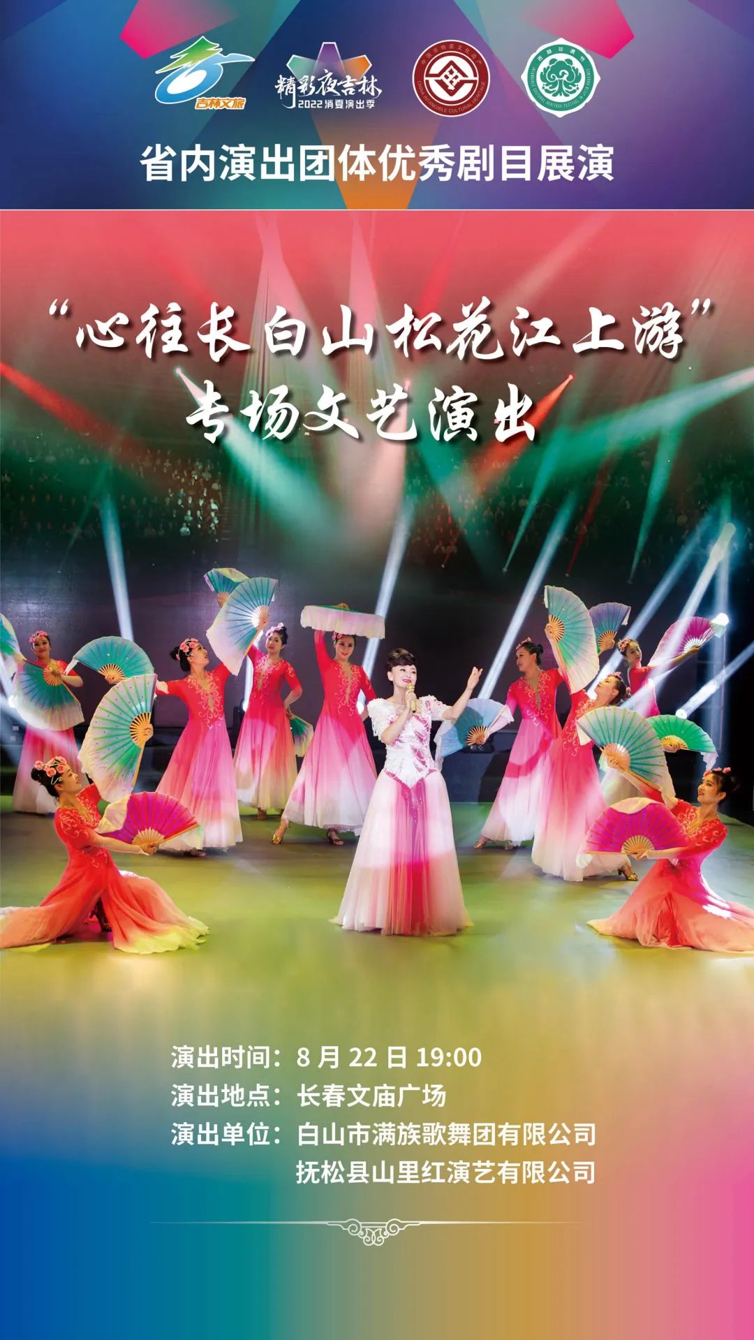8.8月22日19:00为白山市满族歌舞团有限公司、抚松县山里红演艺有限公司带来的“心往长白山松花江上游”专场文艺演出。