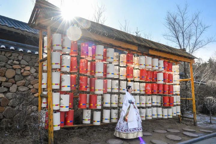 3月7日,在位于延吉市的中国朝鲜族民俗园,游客身穿朝鲜族传统服饰拍照留念。