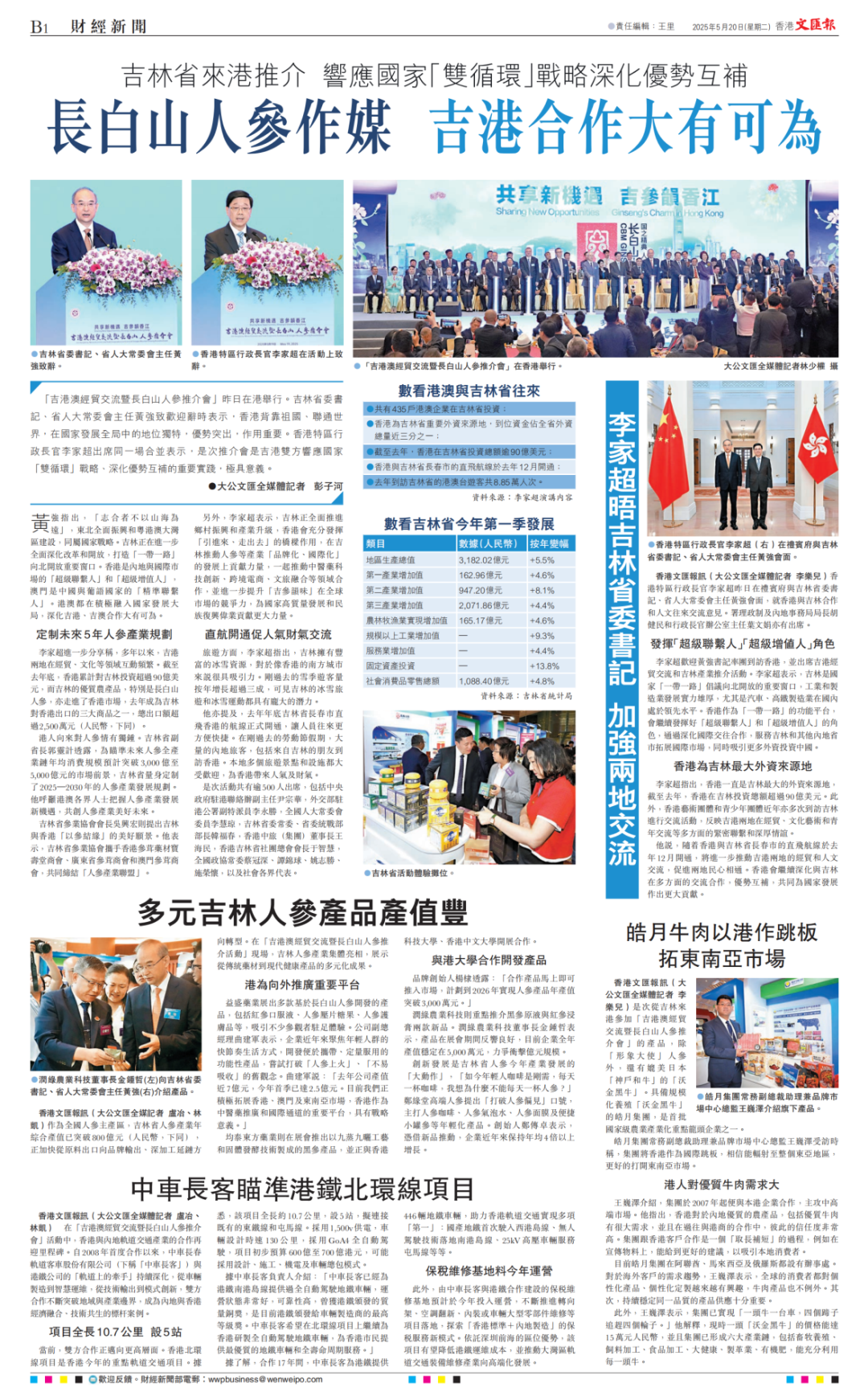 旅游方面,李家超指出,吉林拥有丰富的冰雪资源,对于像香港的南方城市来说很具吸引力。刚过去的雪季游客量按年增长超过三成,可见吉林的冰雪旅游和冰雪运动都具有庞大的潜力。