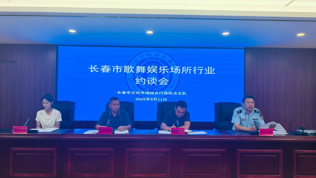 为贯彻落实国家及长春市相关专项整治文件精神,规范我市歌舞娱乐场所经营秩序,根据2025年长春地区文化市场综合执法联训建立的《长春市文化市场“执法+服务”备忘录》协作机制,9月11日,长春市文化市场综合行政执法支队(简称“支队”)联合长春市文化广播电视和旅游局市场处、长春市公安局治安管理支队、长春理工大学法学院共同对全市80余家歌舞娱乐场所开展集中约谈。持续深化未成年人社会保护体系建设,规范歌舞娱乐场所经营秩序,保护未成年人合法权益。