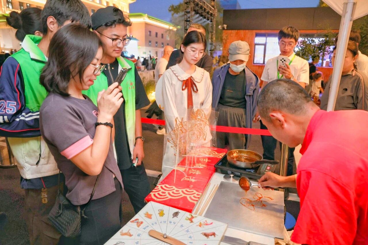 草编、糖画、漆扇等体验项目前排起长队,孩子们围着老师,尽情享受手工的快乐。“这个国庆没去外地旅游,在这儿玩了一晚上,比逛街有意思多了。”大学生王萌拿着自己画的漆扇说。