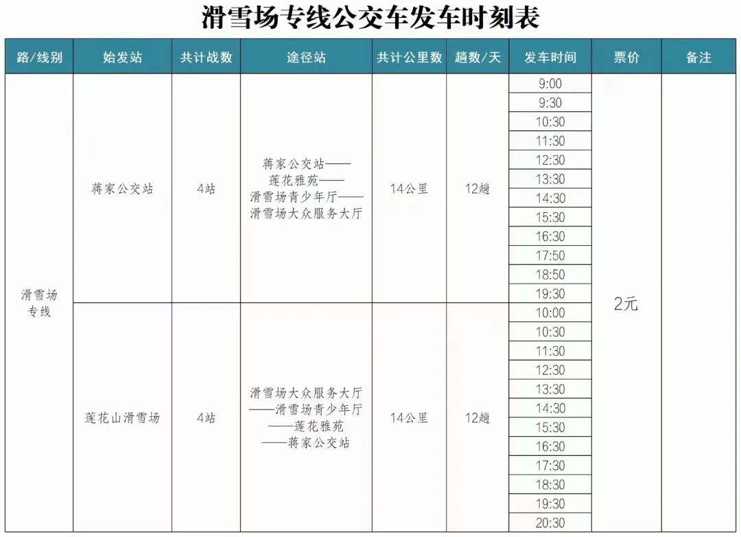 交通方面,除了雪友们熟知的自驾外,现已开通从蒋家公交站驶向莲花山滑雪场的公交专线,仅设立4站,分别是蒋家公交站、莲花雅苑、滑雪场青少年厅、滑雪场大众服务大厅,蒋家公交站始发车时间为9:00,末班车时间为19:30,票价2元。另外从市区到蒋家公交站可乘坐人民广场始发的101路公交车。