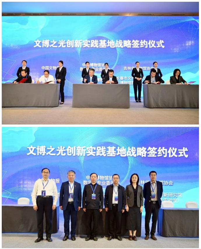 开幕式上还举行了“文博之光创新实践基地”战略签约仪式。伪满皇宫博物院、中国文物报社、中国博物馆协会博物馆数字化专业委员会、吉林省博物馆协会、吉林大学考古学院、长春市文博数智创新研究院(博物馆数智创新实验室)决定依托“文博之光创新实践基地”开展战略合作,面向全国展示和推广文博行业具有重大创新价值的新技术、新产品和新理念,以助推中国文博事业高质量发展。签约后,这些单位将以各自优势资源,协力参与“实践基地”的建设和运营。