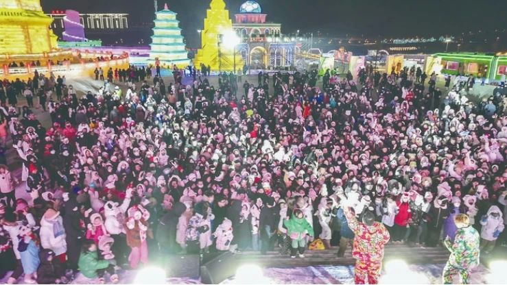 “当时很多南方来的游客都遗憾,说没赶上长春下雪。不下自然雪,咱就人工造雪,长春冰雪新天地主打一个‘宠’字。”陈岩称,每天晚上,景区大舞台旁边四台大功率造雪机一起造雪,让游客观看雪花飞落的美丽瞬间,实现了“暴风雪蹦迪”的浪漫。与此同时,长春市各部门还组织了秧歌表演、演员巡游、歌舞表演等,丰富了园区的活动内容,也让更多南方游客体验到了东北民俗文化。