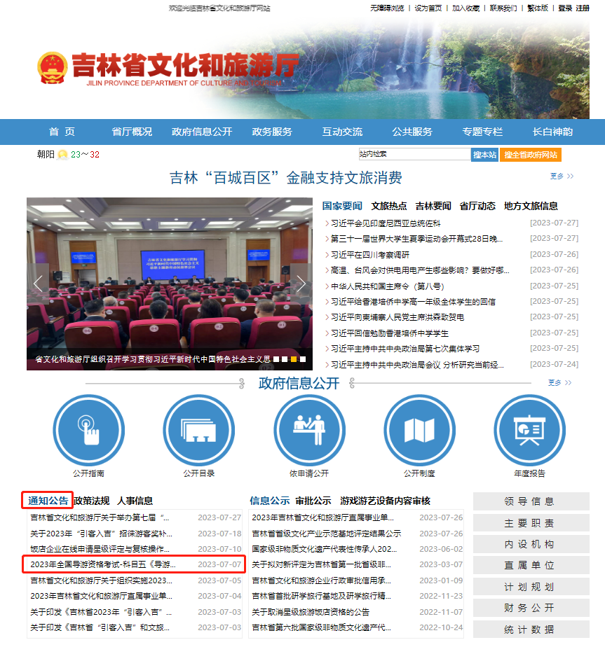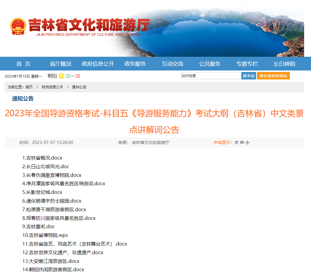 考生可通过吉林省文化和旅游厅网站-通知公告栏,查看并下载吉林省2023年全国导游资格考试-科目五《导游服务能力》考试大纲(吉林省)中文类景点讲解词。