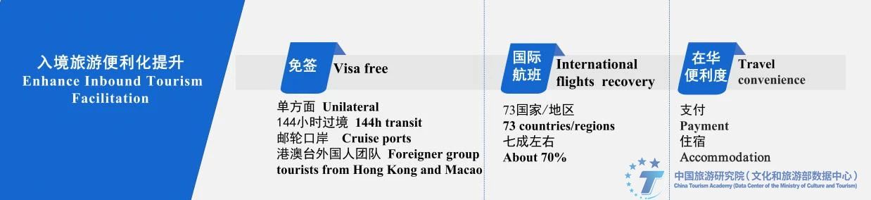 继续提升入境旅游便利化。在签证、支付、住宿登记、票务预订、多语种服务、离境退税等方面继续探索政策制度创新,进一步提高入境游客来华旅行便利度。在签证便利化方面,面向年假时间普遍较长的远程客源市场,建议将单方面免签政策的停留时间从15天延长至30天。进一步发挥144小时过境免签政策的辐射效果,降低外国游客理解以及国内执行该政策的难度,建议允许过境游客A口岸进B口岸出,不再单独规定停留区域。