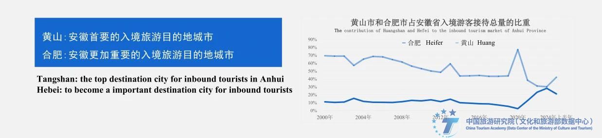 安徽省接待入境游客的目的地结构正在优化。黄山一直是安徽首要的入境旅游目的地城市,合肥作为入境旅游目的地城市的地位有望进一步提升。历年统计数据显示,黄山入境游客接待量对安徽省的贡献总体呈下降趋势,而合肥的贡献在过去几年里有所上升,从疫情前的10%上升到20%。