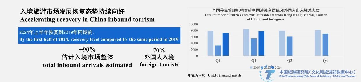 入境旅游市场恢复发展态势持续向好。根据国家移民局的最新数据,2024年上半年,全国移民管理机构查验中国港澳台居民和外国人出入境总人次恢复到2019年同期的92%,一二季度的数据均超过2023年的各个季度,且二季度的表现均好于一季度。2024年上半年,我国入境外国人1463.5万人次,扣除工作、留学、交通乘员等非旅游人群,初步估算来华外国游客约1100万人次,恢复到2019年同期的七成左右。