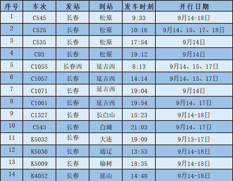 为保障“中秋”假期旅客顺利出行,长春站采取加开临时旅客列车,动车组重联、普速客车加挂等方式增加运能。节假日期间,车站共加开始发临时旅客列车14列,其中延吉方向4列、松原方向4列、长白山、白城、大连、榆树、通辽、昆山方向各1列,最大限度满足旅客出行需求。