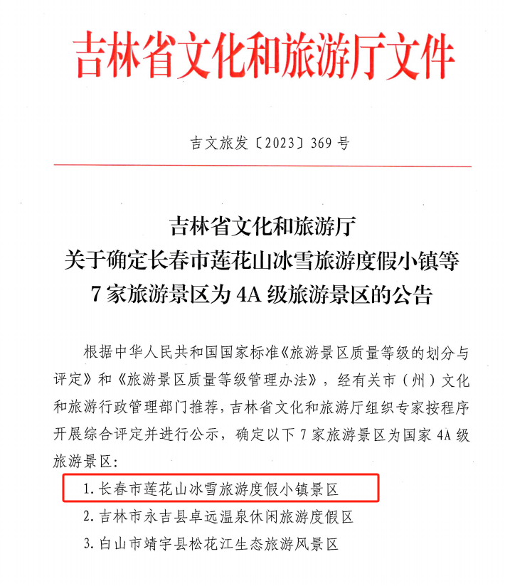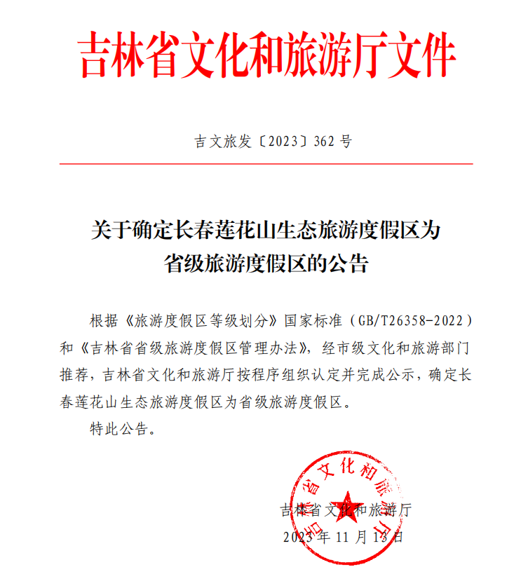 最近,吉林省文化和旅游厅发布两条公告:确定长春莲花山生态旅游度假区为省级旅游度假区,确定长春市莲花山冰雪旅游度假小镇为国家4A级旅游景区