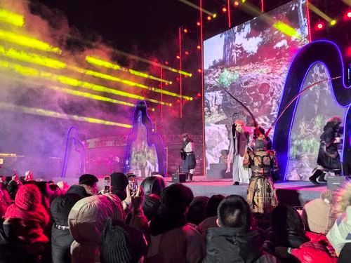 夜幕笼罩下,园区内的沉浸式冰雪戏剧十分吸睛。黑神话悟空游戏中的四个经典片段,被巧妙地改编成舞台剧,在“盖世花果山”等舞台上精彩上演。舞台上,灯光绚丽夺目,宛如梦幻的星辰大海;配乐动感十足,每一个音符都仿佛敲击着人们的心弦。演职人员们以精湛的演技,将游戏中的经典故事活灵活现地呈现在观众面前。期间,不同舞台的迅速转场和沉浸式的现场互动,让大家乐此不疲。