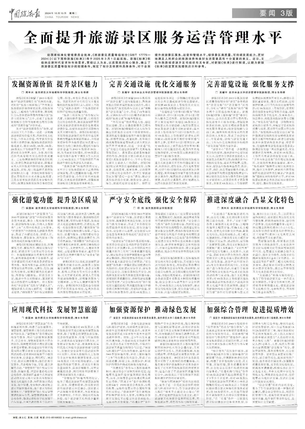 经国家标准化管理委员会批准,《旅游景区质量等级划分(GB/T 17775—2024)》(以下简称新版《标准》)将于2025年3月1日起实施。新版《标准》积极响应新时代要求和市场需求,贯彻以人为本、以质取胜的核心理念,确立了旅游景区质量等级划分的前提条件,规定了划分及依据和具体条件,对于全面提升旅游景区服务、运营和管理水平,增强景区高质量、可持续发展能力,更好地满足人民群众的旅游消费和美好生活需要具有十分重要的意义。近日,文化和旅游部资源开发司组织有关专家,对新版《标准》进行解读,以期为新版《标准》的宣贯实施提供启示和参考。