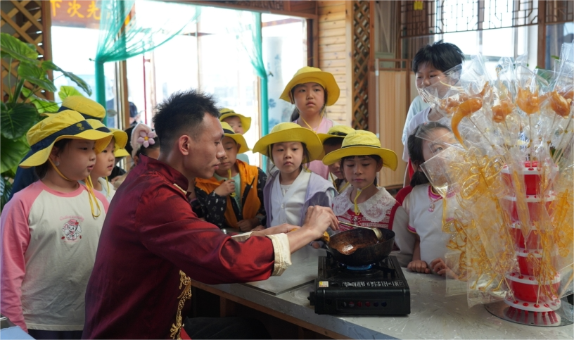 在辽金时代文化园进行展示展演的非遗项目有糖人、糖画、草编。参加研学的同学们对糖画产生了浓厚兴趣,在非遗传承人的指导下,同学们亲手体验了糖画的制作,在实践中感受了优秀传统文化的魅力。