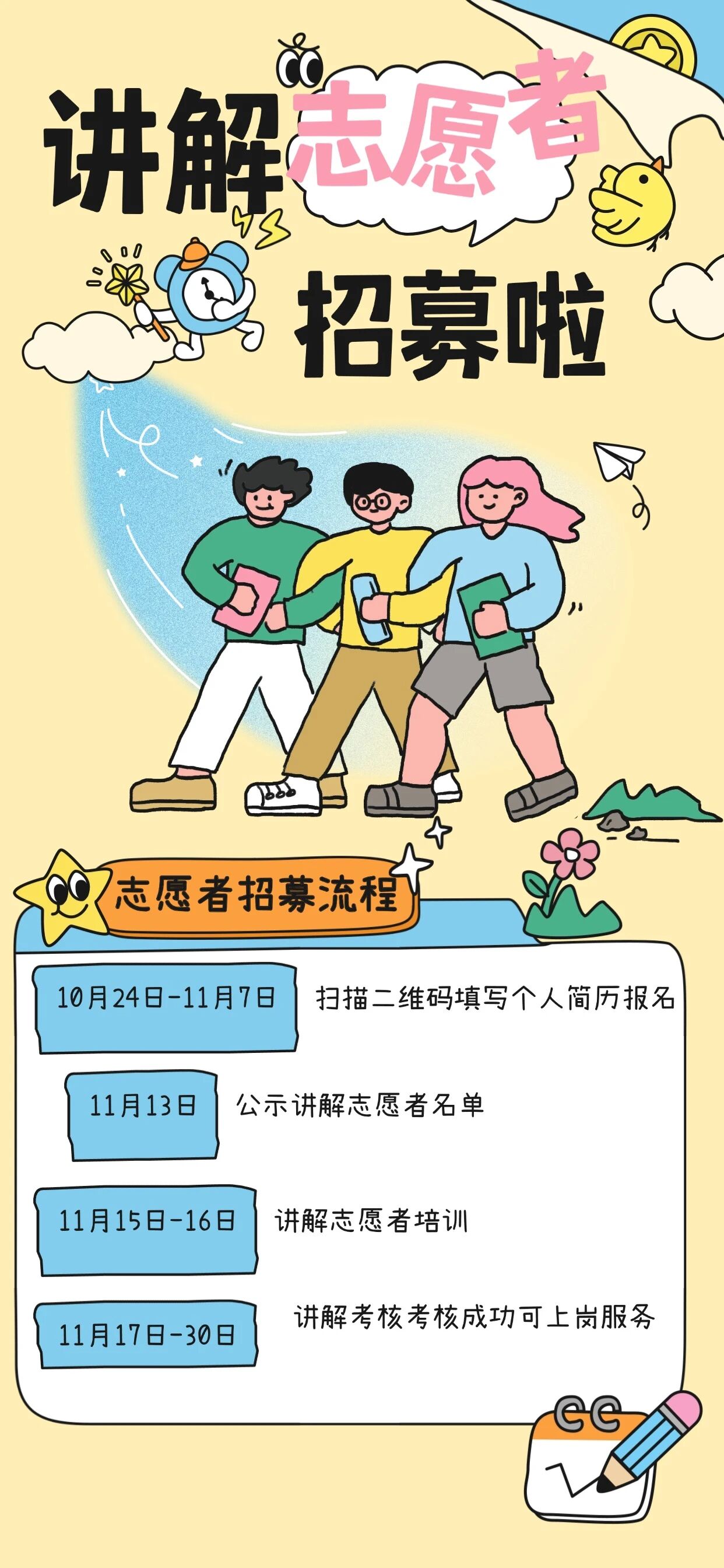 此时间段的周二至周日9:30-11:00\14:00-15:30为志愿者讲解词岗前考核时间。并于2025年12月1日15点前公示最终入选名单,请及时关注此公众号推送信息。