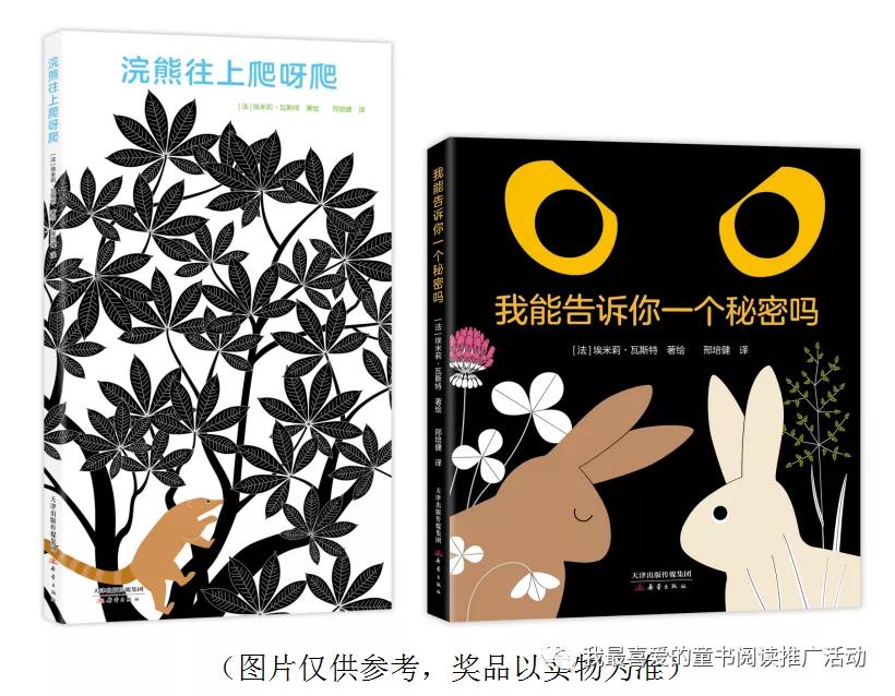参与奖15名,奖品为作者埃米莉·瓦斯特精美绘本《浣熊往上爬呀爬》或《我能告诉你一个秘密吗》随机一本。