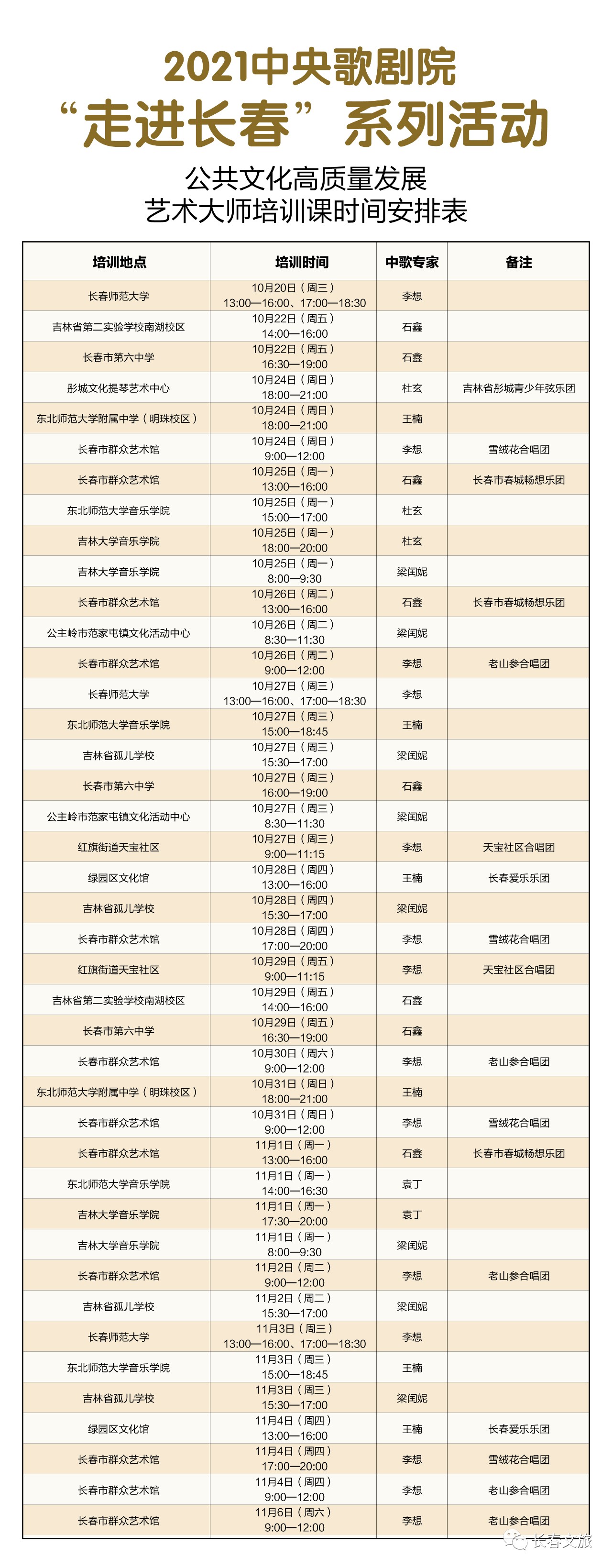 为了做好此次培训工作,让广大市民在家门口享受到高质量的精神文化产品,长春市文广旅局积极协调相关单位,组织中央歌剧院相关专家将分别到吉林大学、东北师范大学、长春师范大学、东北师范大学明珠校区、长春市第六中学、吉林省孤儿学校、公主岭市范家屯镇、天宝社区、绿园区文化馆等6个不同层面涵盖大学、中学、小学、社区、乡镇、群众艺术团等14个单位开展高质量的培训服务活动。为合唱团、乐团等举行声乐理论、合唱及器乐培训等活动,总计培训160课时。
