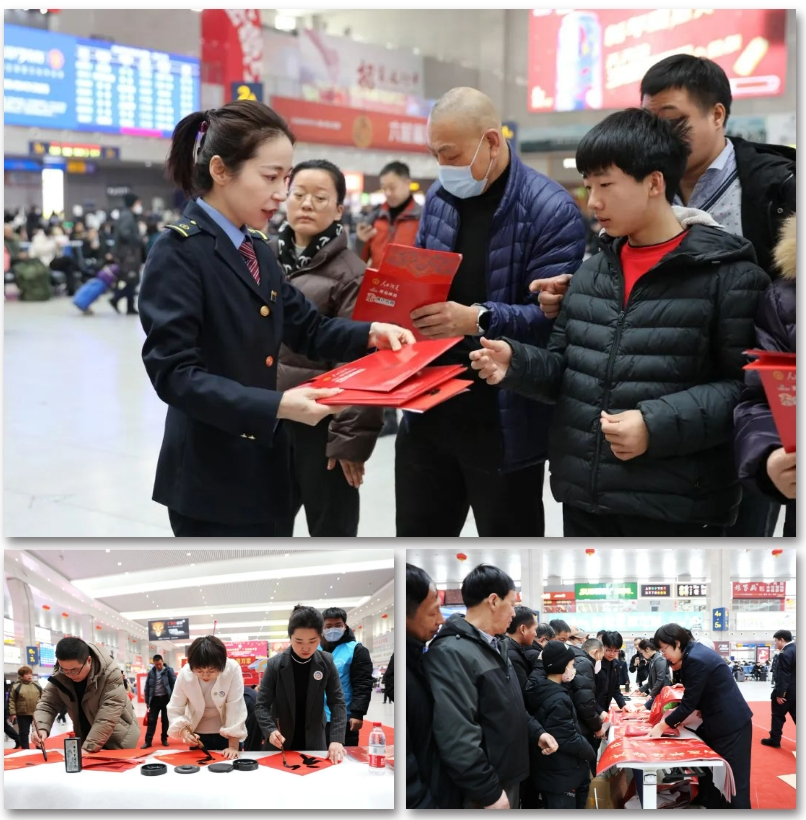 千门万户曈曈日,总把新桃换旧符。为了丰富活动内容,省委宣传部和省文联提供了千余幅春联福字,赠送给候车的旅客,带去期盼与祝福。本次活动还邀请省内知名书法家现场书写“福”字和对联送给旅客,受到群众欢迎,把幸福、喜悦带回家。通过新时代文明实践走进长春火车站演出活动的举办,不仅营造了良好的节日文化氛围,而且让旅客领略吉林文化的风采,缓解路途的疲惫,温暖回家路。