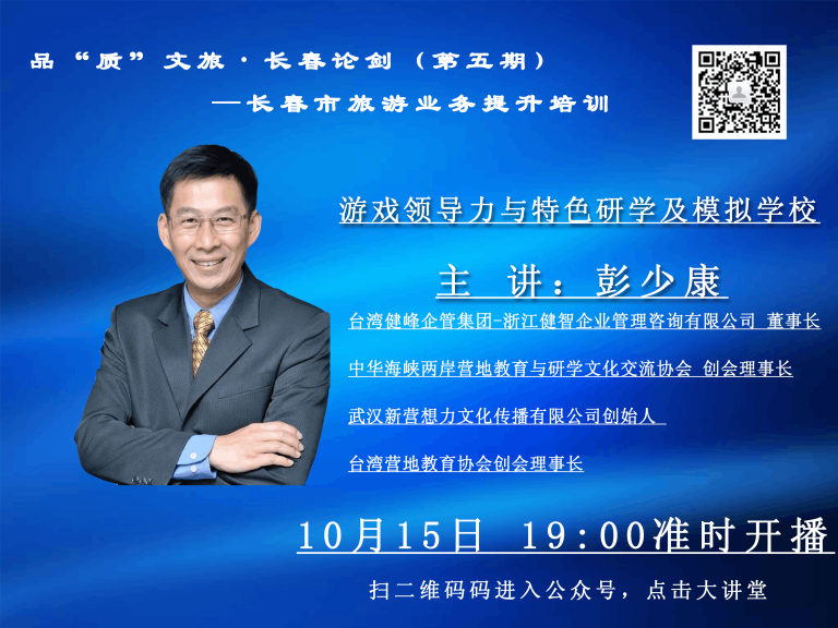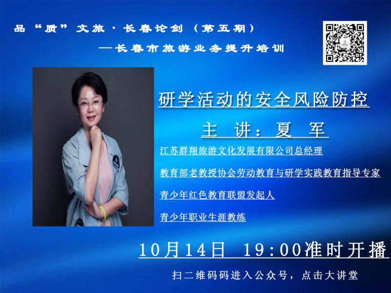 为扎实做好“六稳”工作,全面落实“六保”任务,全面贯彻十一部委《关于推进中小学生研学旅行的意见》精神,推进旅游企业扩大复工复业,促进旅游市场恢复和研学旅行市场发展,提升旅游从业人员队伍的综合素质和业务能力,为我市培养一批服务好,专业精,素质髙的复合型文旅人才,长春市文化广播电视和旅游局邀请国内省内知名专家学者,组织开展品“质”文旅-长春论剑(第五期)-旅游业务提升培训。