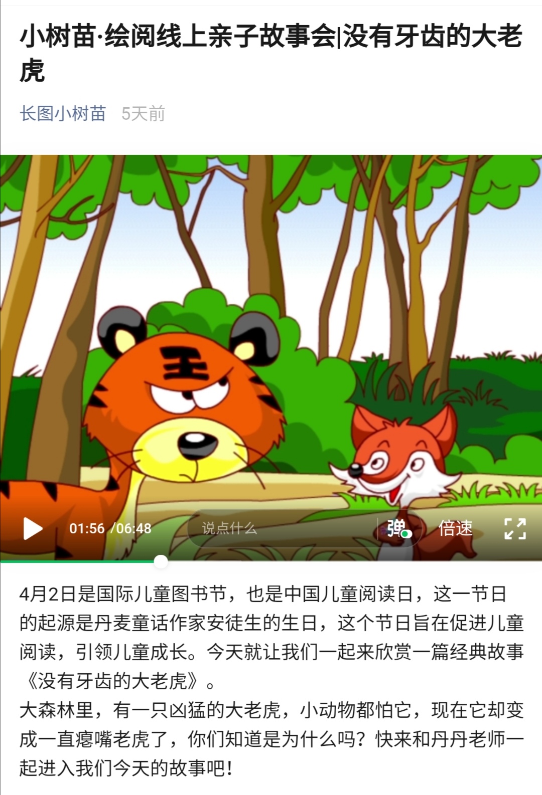 长图小树苗品牌活动“绘阅亲子故事会”以“书香浸润童年”为主题,由故事姐姐线上讲述了《没有牙齿的大老虎》绘本故事,让孩子们在童书中感受阅读的乐趣。