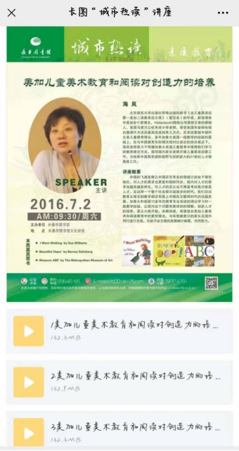“城市热读”公益讲座特别遴选了由美国马里兰公校系统小学海岚老师主讲的《美加儿童美术教育和阅读对创造力的培养》讲座,进行线上回放。海岚老师凭借加拿大和美国10多年的教育专业系统的理论学习和一线教学经验,深刻理解了创新人才的培养需要从小开始的道理,结合美加儿童美术和阅读教育中的某些做法,与有前瞻意识的家长及国内同行进行交流,为孩子这方面的发展献计献策。共有100余人收听讲座,并热情反馈,认为讲座对他们在孩子的成长教育方面有很大的帮助。