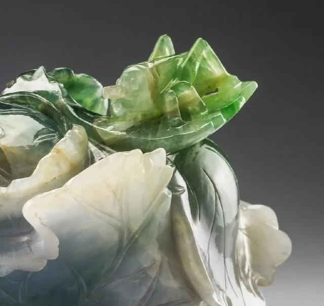 翠玉白菜由一个完整的翠玉雕刻而成,白色雕刻成菜帮,绿色雕刻成菜叶,菜叶之上,还雕刻了蚱蜢和蝈蝈。