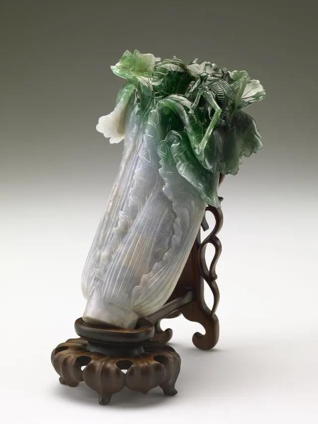 在清代,白菜代表清清白白,蝈蝈寓意多子多福,因而翠玉白菜也就成为绝佳的嫁妆选择。据传,这件翠玉白菜是光绪瑾妃的嫁妆。