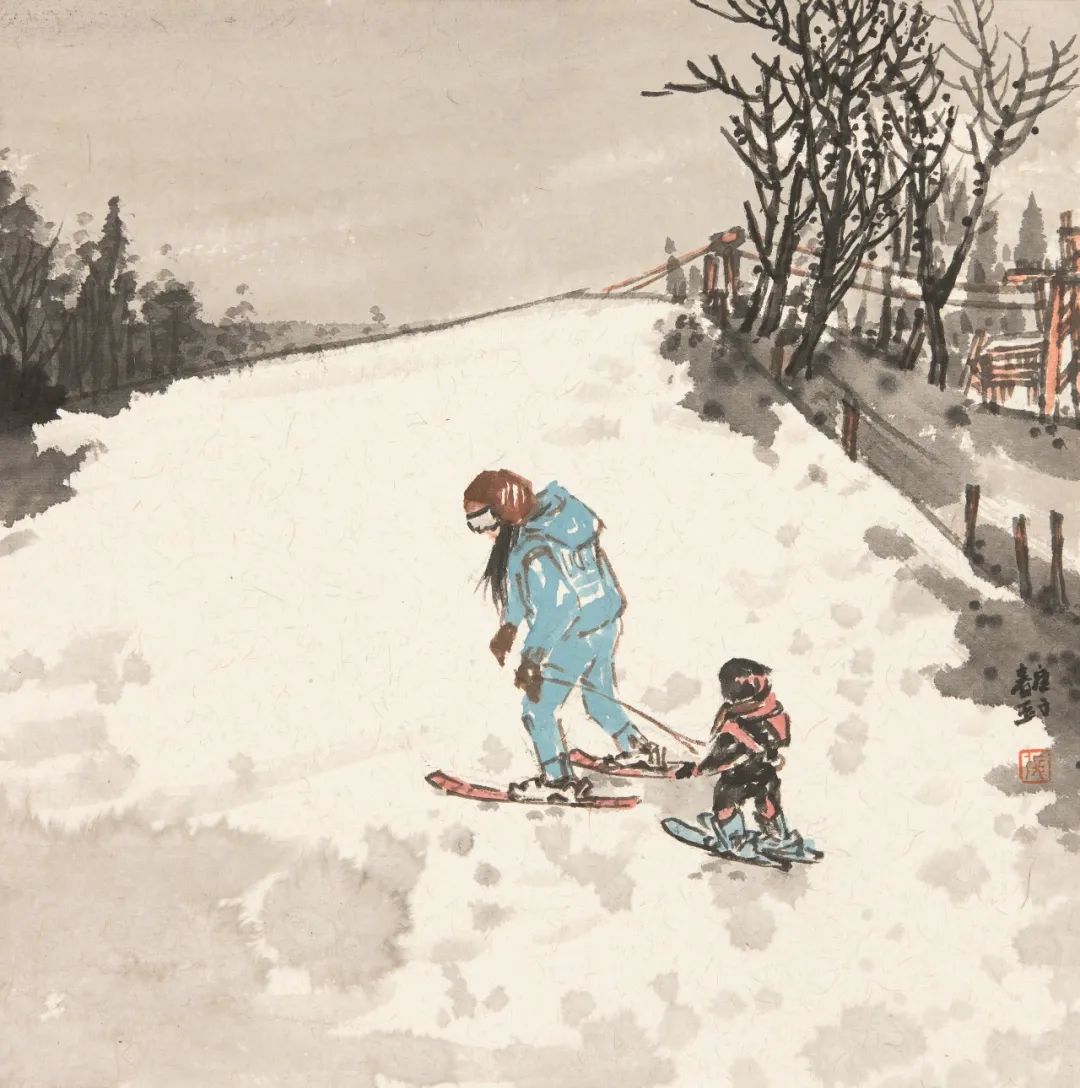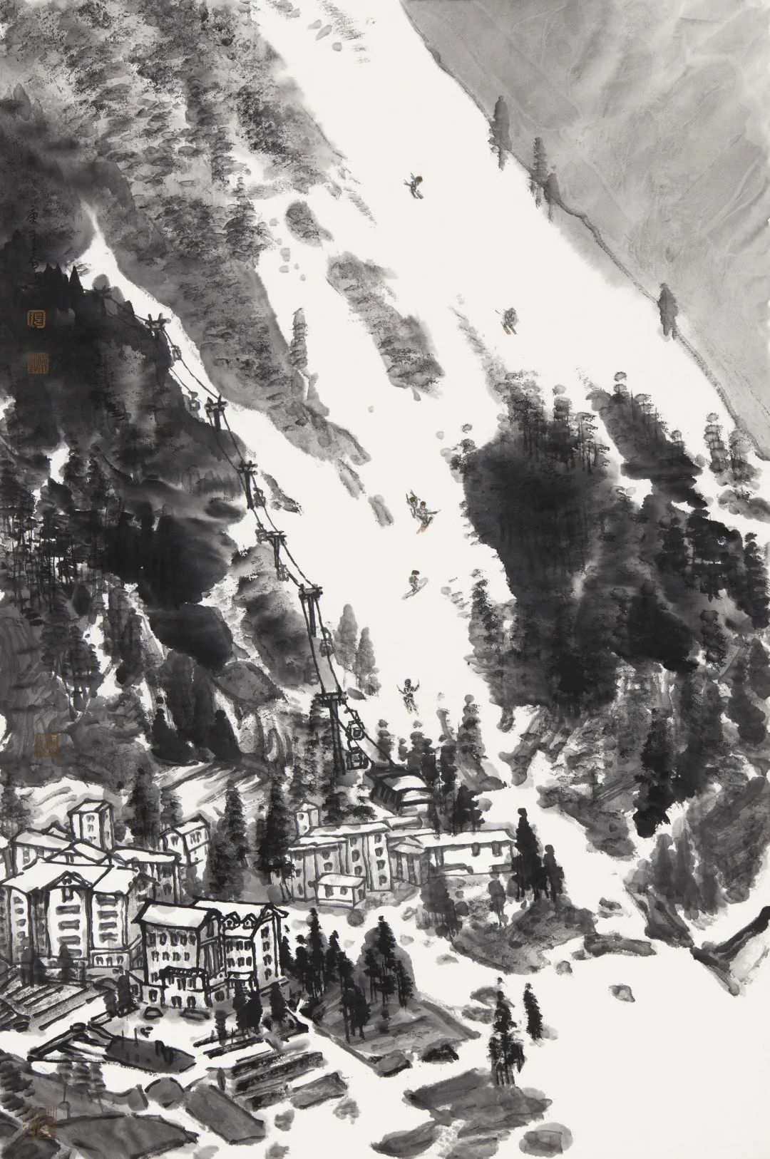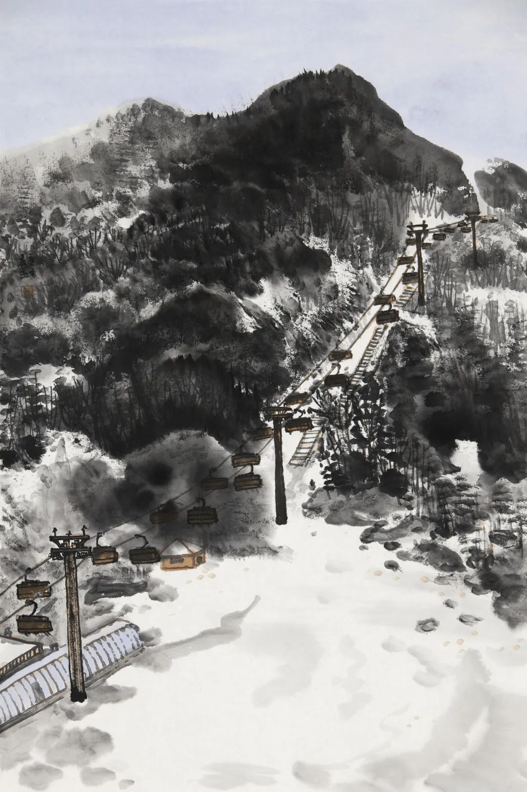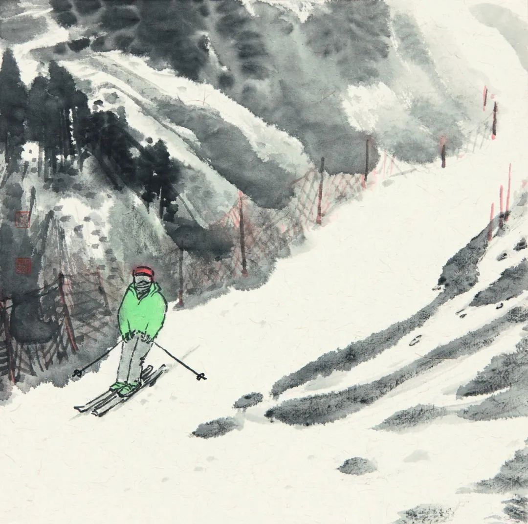作者将对自然的观察与对冰雪画艺术的理解表现在蓬松的粉雪、天然的雪场、冬日的长白、浓郁的地域文化之中。在作者笔下,高山雪场、雪道交错,雪色相宜,既有“晴雪入新画”之清新自然,也有雪覆远山千里绵延,如“隔牖风惊竹,开门雪满山,洒空深巷静,积素广庭闲”之清寒寂静、宽广空阔。