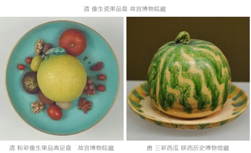 图中的大螃蟹、大桔子、大西瓜,可不是菜市场里可供选择的货品,而是陈列在博物馆中的珍贵文物。它们并非真正的食物,而是陶瓷制品。
