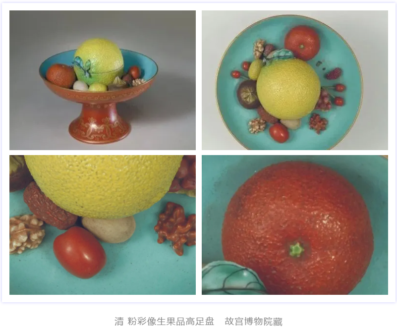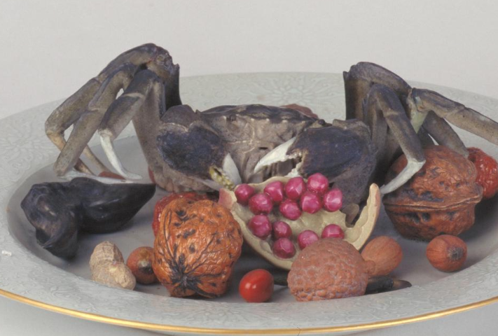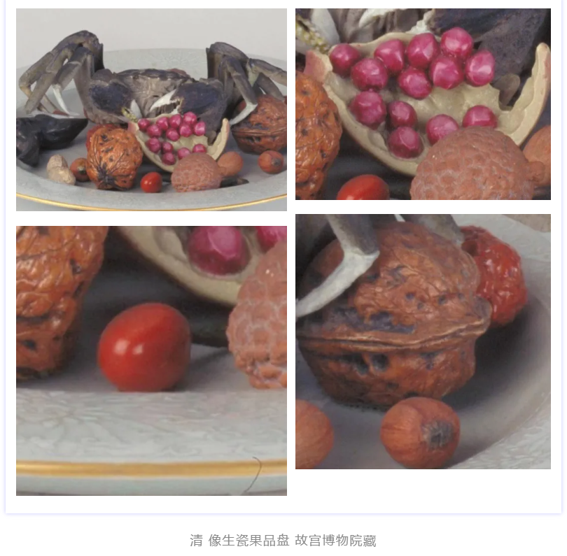 这两件果盘中,有核桃仁、桑椹、樱桃、荸荠、石榴、桔子、枣、白果、螃蟹、荸荠、荔枝等多种食物,酷似原物,真假难辨。