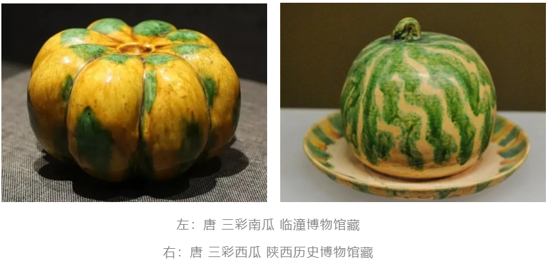 上图中的三彩南瓜与西瓜是较为罕见的象生食物唐三彩,都属国家一级文物。