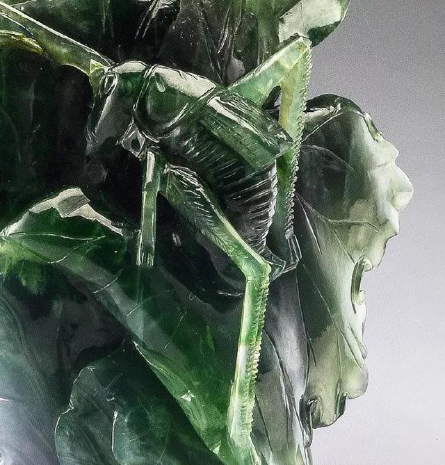 翠玉白菜由一个完整的翠玉雕刻而成,白色雕刻成菜帮,绿色雕刻成菜叶,菜叶之上,还雕刻了蚱蜢和蝈蝈。