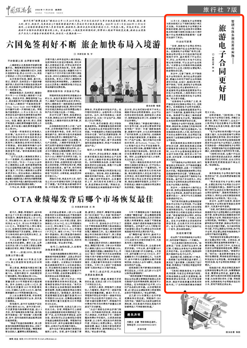12月9日,《旅游电子合同管理与服务规范》(以下简称《规范》)将正式实施。作为旅游电子合同普及率较高的领域,旅行社在使用中有哪些难点和问题?《规范》实施之后又将对整个行业带来哪些积极影响?中国旅游报记者对此进行了采访。